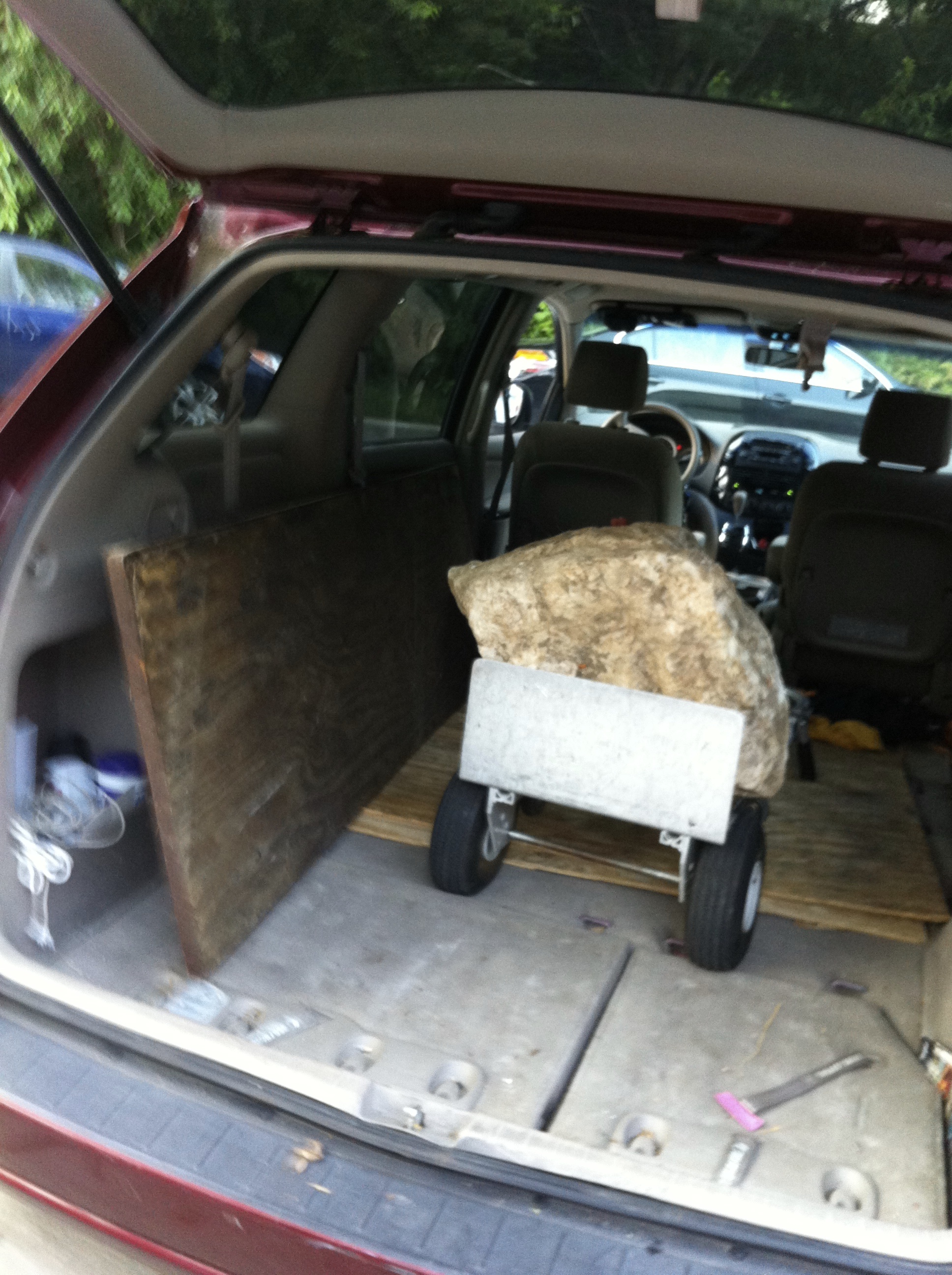 Greg has a dolly he uses for his circus equipment. The three of them managed to roll The Rock onto the dolly and roll the dolly with The Rock to the back of Greg’s station wagon.